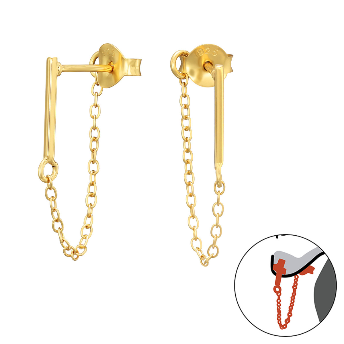 Egyenes 24k aranyozott láncos ezüst stift fülbevaló, kétoldalas
