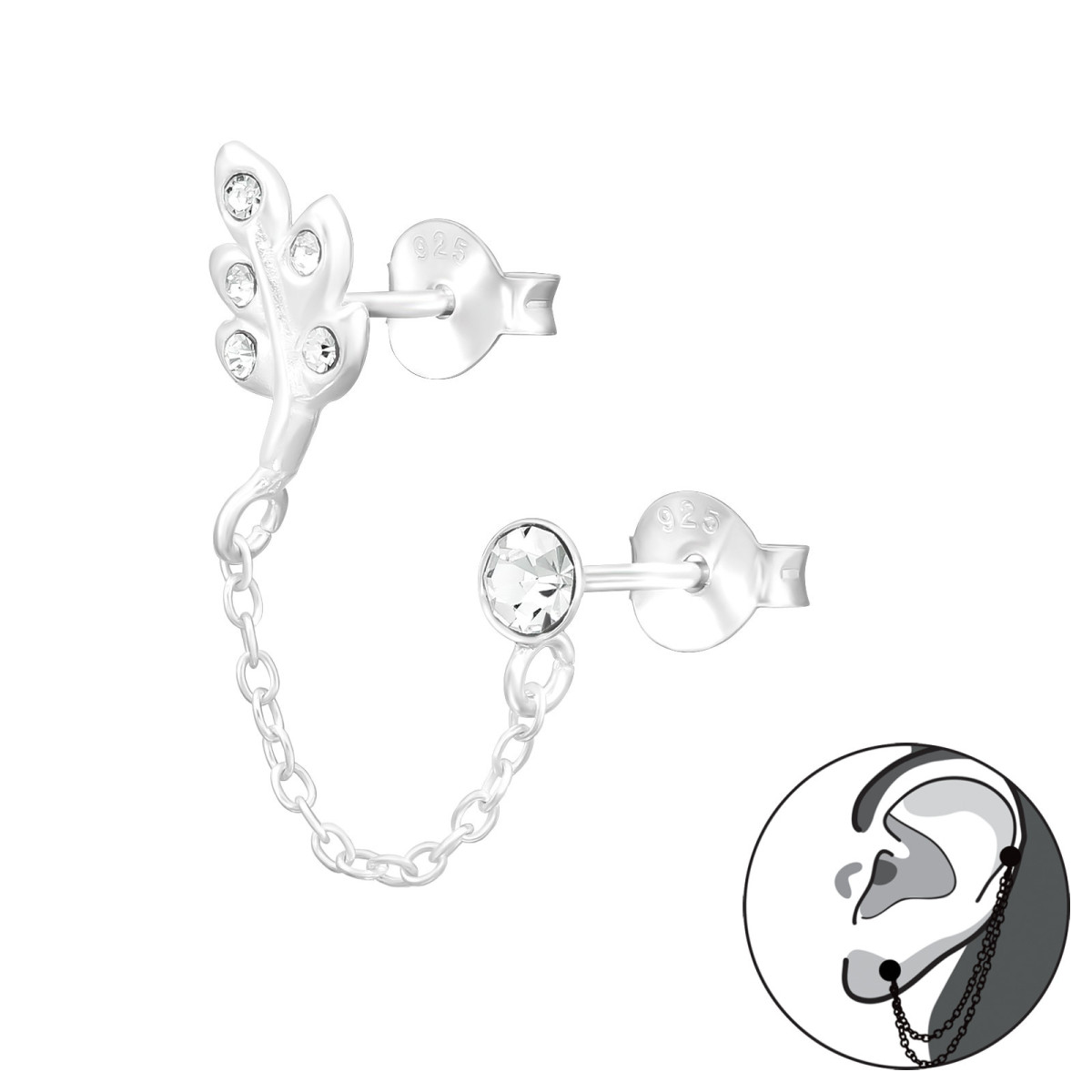 Falevél kristály köves láncos ezüst stift és fülcimpa fülbevaló, kétoldalas