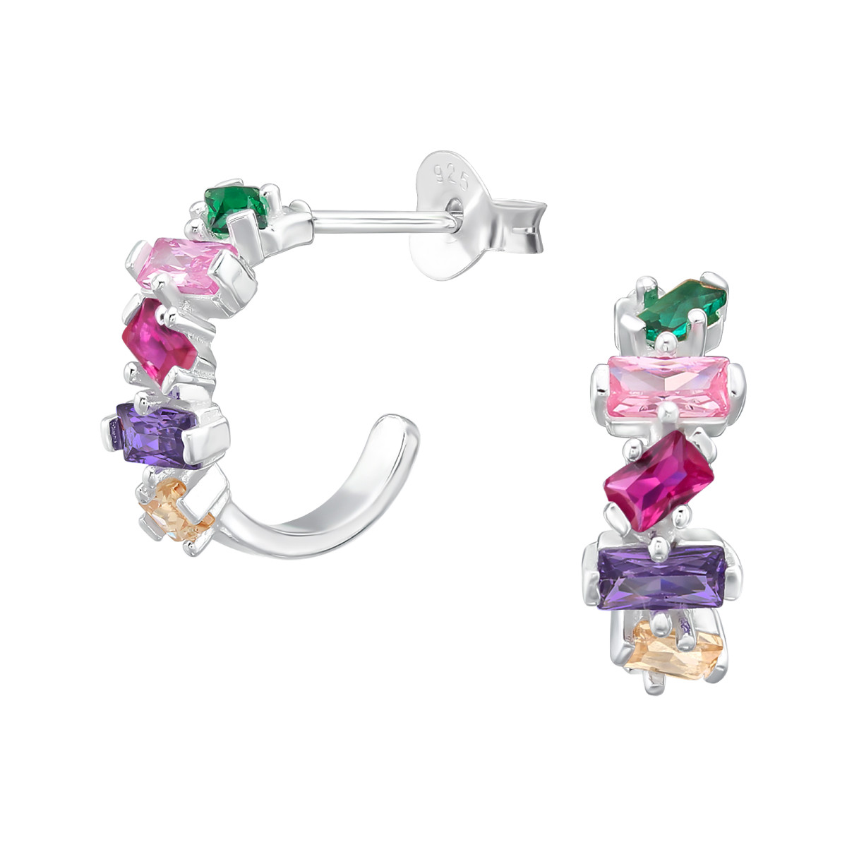 Félkarika négyzetes színes cirkónia köves 925 ezüst stift fülbevaló