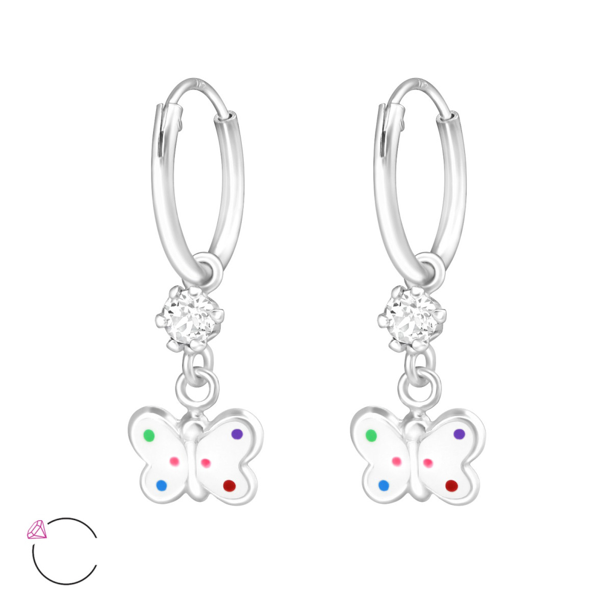 Fehér lepkés, pöttyös köves lógó ezüst karika gyerek fülbevaló