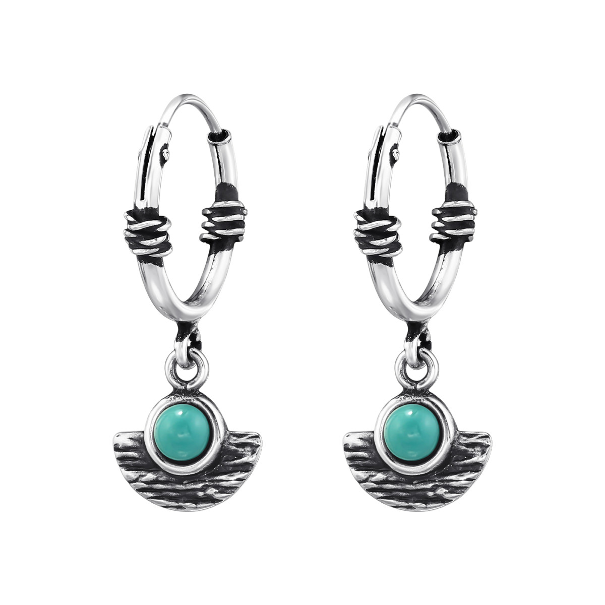 Türkizkék függős Bali stílusú ezüst női karikafülbevaló